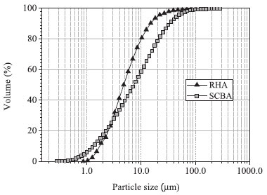 ![]() Figure 1. Particle size distribution obtained by laser diffraction analyses of RHA and SCBA