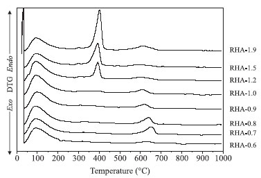 RHA-Ca(OH)2 pastes The thermal analyses results for the RHA pastes at the age of 50 days are shown in Figures 3 and 4. The DTG curves shown in Figure 3 exhibit endothermic peaks at approximately 90 ºC, 400 ºC and 600-650 ºC, which correspond to the dehydration of C-S-H, the dehydroxylation of the Ca(OH)2 and decomposition of CaCO3 by carbonation,26 respectively.