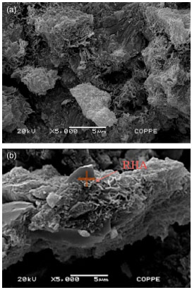 ![]() Figure 6. Scanning electron microscopy images of RHA-1.0 (a). In (b), a RHA grain covered by C-S-H
