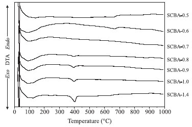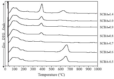 SCBA-Ca(OH)2 pastes The DTG and DTA curves of the SCBA pastes are shown in Figures 8 and 9, respectively. The endothermic peaks corresponding to dehydration of C-S-H, dehydroxylation of the Ca(OH)2 and decomposition of CaCO3 (at about 90 ºC, 400 ºC and 600-650 ºC respectively) were the same as for RHA. However, endothermic peaks at 120 ºC, 195 ºC and 240 ºC can also be seen. They are related to the dehydration of gehlenite hydrate (2CaO·Al2O3·SiO2·8H2O), tetracalcium aluminate hydrate (4CaO·Al2O3·13H2O) and hydrogarnet (3CaO·Al2O3·SiO2·6H2O),30 respectively. It is interesting to note that, if on one hand gehlenite hydrate can be detected in all mixtures, tetracalcium aluminate hydrate is only found in SCBA-0.5, SBCA-0.6, SCBA-0.7, and SCBA-0.8. In addition hydrogarnet dehydration only appears as a very wide peak in SCBA-1.4. It is noteworthy that no exothermic peak at higher temperatures was perceived, an indicative that the main product was not C-S-H (I).