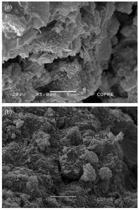 The products of selected C/S pastes were also characterized by X-ray diffraction (XRD). Samples containing RHA were scanned over a 10º-60º 2θ range, while the SCBA- Ca(OH)2 samples were analyzed in a 5º-60º 2θ range in order to investigate the presence of carboaluminates. The samples RHA-0.5, RHA-1.0, RHA-1.9, SCBA-0.5, SCBA-0.7 and SCBA-1.4 were analyzed after 50 days of curing. In order to study the morphology of the pastes, scanning electron microscope (SEM) images were obtained in a JEOL JSM 6460 LV microscope, operating in 20 kV and working distance of about 10 mm. The microscope was equipped with an energy dispersive x-ray spectrometer (EDS) Thermo C 1015. The samples were gold-coated under vacuum.