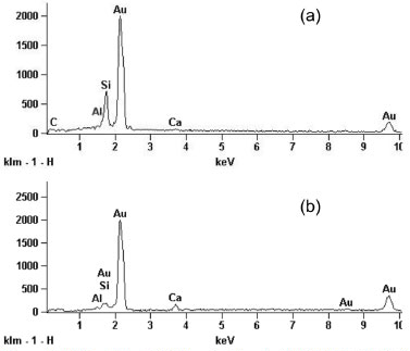 The morphology of the products formed in the paste SCBA-0.7 can be observed in Figure 11 and it showed to be different from the RHA mixture. The C-S-H gel seems to be dense constituted by amorphous agglomerations. The aluminate products appear as thin plates or needles, mostly deposited inside of pores, as can be better seen in Figure 11a. In the image of Figure 11b, it is possible to see a SCBA grain partially covered by the hydration products and a calcium alumino silicate hydrate plate. Both the SCBA particle and the C-A-S-H were analyzed by EDS and the spectrums are presented in Figure 12. Once again, the coating of the sample resulted on the appearance of peaks related to gold (Au).