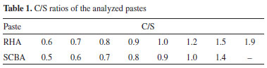 EXPERIMENTAL Materials Rice husk was received from rural producers in the State of São Paulo, Brazil. It was burnt in a muffle furnace at 600 ºC, with a heating rate of 10ºC/min for 3 hours24 and dry ground during 120 minutes in a vibratory mill to obtain amorphous silica, low carbon content and ultrafine particles (median particle size, D50, above 10 µm). On the other hand, a raw sugar cane bagasse ash was collected from the boiler during a cleaning operation from a sugar/alcohol plant in the state of Rio de Janeiro, Brazil. The residual SCBA was then burnt in a muffle furnace in two steps: at 350 ºC during 3 hours and at 600 ºC for another 3 hours.25 This burning was made to decrease the high carbon content in the residual ash. Finally, it was dry ground for 8 hours in a rotational ball mill. Chemically pure calcium hydroxide and deionized water were also used in the mixtures. The particle size distribution of both ashes was measured using a Malvern Mastersizer laser diffraction analyzer with deionized water as dispersant. The oxide percentages were determined by X-ray fluorescence (XRF) using a Shimadzu EDX 800 spectrometer with Rh tube and the specific surface area was measured according to the N2 adsorption (B.E.T.) using a Micromeritics Accupic. X-ray diffraction patterns (powder method) were taken using a Bruker D8 Focus diffractometer with Cu-Kα radiation (40 mA; 40 kV; 10º < 2θ < 60º; 0.03º step; 1 s couting time). Methods Two sets of mixtures were manually prepared, one of RHA and Ca(OH)2 pastes and the other of SCBA and Ca(OH)2 pastes. Firstly, the mixtures were made in order to obtain initial C/S molar ratios varying from 0.6 to 1.0. After some preliminary results, complementary pastes were produced, in order to obtain more comprehensive ranges of C/S values. All analyzed mixtures, and their C/S ratios, are presented in Table 1. The water/solids ratio (in mass) was 1.3 for all mixtures. This value was the minimum ratio in order to produce homogeneous pastes with the materials used in this work. The pastes were cured in sealed plastic films in a temperature controlled room at 40 ºC.15 In this paper, the samples were denominated as ASH-CS where ASH stands for RHA or SCBA and CS represents the C/S ratio of the mixture. In that way, the sample of RHA paste with C/S ratio of 0.6 was named RHA-0.6.