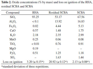 RESULTS AND DISCUSSION RHA and SCBA characterization The particle size distributions of both RHA and SCBA are shown in Figure 1. The SCBA is slightly coarser than the RHA: the former presented D50 of 7.37 µm, while the latter exhibited D50 of 4.75 µm. Both ashes can be considered as ultrafine. The obtained RHA had B.E.T. specific surface area of 66.91 m2/g, whereas the SCBA had one of 25.00 m2/g. The oxide percentages (by mass) of RHA and SCBA, measured using the X-ray fluorescence method and their loss on ignition are presented in Table 2. It is worthy of notice the high silica content of both ashes. Figure 2 exhibits the X-ray diffraction (Cu Kα radiation) patterns of the ashes. The silica present in the RHA was mostly amorphous, what can be seen by the background hump between the Bragg's angles of 15º and 25º on the RHA's pattern. In contrast, the pattern of the SCBA indicates the presence of quartz, as it has been observed in several studies on residual bagasse ash.7,21,23