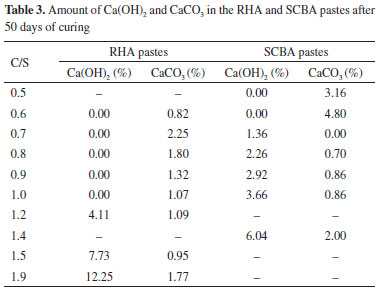 Table 3 shows the amount of unreacted Ca(OH)2 and CaCO3 in SCBA pastes at the age of 50 days. For the pastes SCBA-0.5 and SCBA-0.6, 50 days was enough for the complete reaction of the Ca(OH)2 of the pastes. In contrast, for the rest of the mixtures, the adopted time was not sufficient for the whole consumption of Ca(OH)2 and the paste that presented the minimum amount of that compound was SCBA-0.7. Figure 10 displays the XRD patterns of the mixtures SCBA-0.5, SCBA-0.7 and SCBA-1.4. Peaks related to CaCO3 and quartz can be seen in all three pastes. There was evidence of Ca(OH)2 (portlandite) only for the C/S 1.4 mixture. The X-ray patterns did not show any crystalline product from the reaction between SCBA and Ca(OH)2, indicating that they probably have low or null crystallinity degree. Similar results were obtained by Frías and Villar-Cociña.22 It is important to note that the XRD patterns did not show the presence of carboaluminates, although the SCBA sample presents an expressive amount of Al2O3 (16.83%).