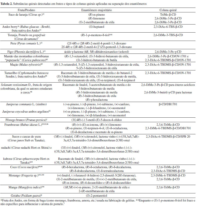 CROMATOGRAFIA GASOSA QUIRAL NA PESQUISA DE FLAVOURS DE FRUTAS Os enantiômeros predominantes encontrados em frutas e as colunas empregadas nas análises de diversas frutas são apresentados na Tabela 2.