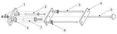 ![]() Figura 1. DAP II. Esquema técnico para montagem do DAP II. 1) porcas e arruela, 2) seringa, 3) guia, 4) base, 5) barra roscada, 6) bucha nylon, 7) seringa, 8) bucha da guia