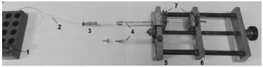 ![]() Figura 2. DAP II modificado e o sentido do seu funcionamento para inserção a vácuo. 1) reservatório de sol, 2) capilar, 3) conectores para o capilar e a agulha, 4) seringas, 5) plataforma fixa, 6) plataforma móvel, 7) componentes auxiliares para injeção a vácuo