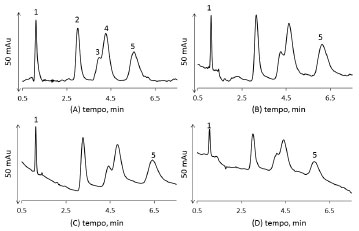 ![]() Figura 3. Eletrocromatogramas obtidos em colunas produzidas em réplicas (A a D) com o DAP II modificado, em capilar TSU. Ordem de eluição: 1) tiouréia, 2) naftaleno, 3) acenafteno, 4) fluoreno e 5) fenantreno, diluídos em metanol a 1,0 mmol L-1. Fase móvel: NH4Ac 16,7 mmol L-1 (60%) e acetonitrila (40%); voltagem: -20 kV; temperatura: 20 ºC; injeção: -25 mbar por 5 s; detecção: 220 nm
