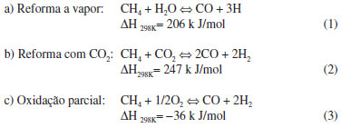 Atualmente, a rota mais empregada na indústria para a produção de hidrogênio é a reforma de metano com vapor de água (1), sob catalisadores de níquel em uma faixa de temperatura de 800 a 900 ºC e pressão de 25 bar.2 Para eliminar o CO utiliza-se as reações de deslocamento de baixa e alta temperatura (4), conhecidas respectivamente como reações LTS (Low Temperature Shift) e HTS (High Temperature Shift), nas temperaturas respectivas de 200 e 400 ºC.