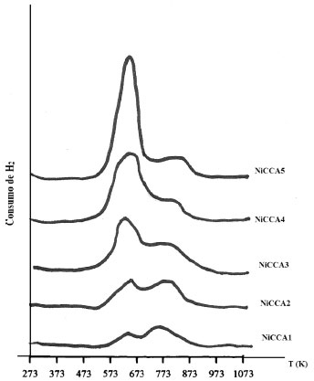 ![]() Figura 1. Curvas de TPR dos catalisadores de NiCCA