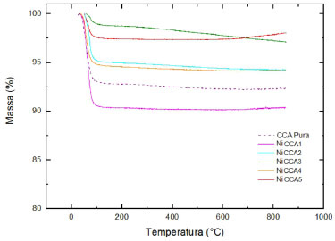 ![]() Figura 3. Curvas de ATG para as amostras catalíticas de CCA e NiCCA