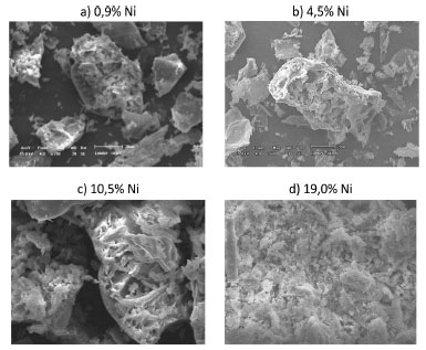 Assim, a dispersão e a área metálica do níquel dependem da quantidade de metal depositada no suporte. Alguns autores prepararam catalisadores com alta quantidade de níquel finamente disperso, mas estes catalisadores mostraram uma tendência à sinterização durante a reação.23 Os vários catalisadores foram analisados por microscopia eletrônica de varredura como mostrado na Figura 4 a seguir referentes às amostras de NiCCA. Através dessa analise se pode constar que a medida que o teor de níquel aumenta, percebe-se um aumento do grau de aglomeração apresentado pelas partículas.De outro lado, nota-se que as partículas não apresentam, aspectos homogêneos nem tamanho de poros bem definidos.