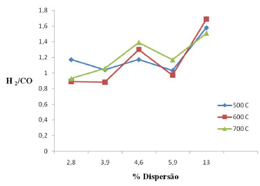 ![]() Figura 5. Variação da razão H2/CO em função da dispersão do Ni na CCA