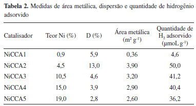 A curva de TG apresenta um pico de perda de massa bem definido na região que vai da temperatura ambiente até 85 ºC, que é atribuído à perda de água, provavelmente fisissorvida na superfície do catalisador. A perda de massa relativa nessa região varia de aproximadamente 0,9% a 9,9%, obedecendo à seguinte ordem crescente de perda de água; NiCCA3<NiCCA5<NiCCA2<NiCCA4<CCA<NiCCA1. A partir da comparação das curvas de TG obtidas para a CCA pura com os demais catalisadores de NiCCA pode-se concluir que não houve nenhuma reação que pudesse indicar uma mudança na estrutura dos catalisadores, ou seja, pode-se descartar a presença de reagentes contaminantes que poderiam reagir com os catalisadores; assim, a massa dos mesmos permanece constante após a perda de água e consequente aumento de temperatura. Nas curvas de DSC mostradas na Figura 2S observa-se também a transição endotérmica correspondente à perda de água, a qual tem início acima da temperatura ambiente e termina pouco acima de 100 ºC; nenhum outro evento térmico significativo é detectado em temperaturas mais altas. Dessa forma, os resultados de TG discutidos anteriormente são completamente coerentes com os de DSC, com a amostra NiCCA3 apresentando a menor perda de água e a amostra NiCCA1 exibindo a maior perda de água, conforme apontado na relação anterior. Os resultados de adsorção química podem ser observados na Tabela 2, onde os catalisadores de níquel suportados em cinza de casca de arroz, após redução a 773 K em hidrogênio, são relacionado a partir de medidas de dispersão, área metálica e quantidade hidrogênio adsorvido. Pode-se observar que à medida que aumenta o teor de níquel, isto é de 0,9% para 4,5%, aumenta inicialmente a dispersão da fase metálica. Entretanto o aumento subseqüente do teor de níquel causa um progressivo decréscimo nos valores de dispersão. Assim, o catalisador com teor de níquel intermediário de 4,5% é o que apresenta a maior medida de dispersão. O aspecto anteriormente ressaltado também é valido para as medidas de área metálica e quantidade de hidrogênio adsorvido irreversivelmente.