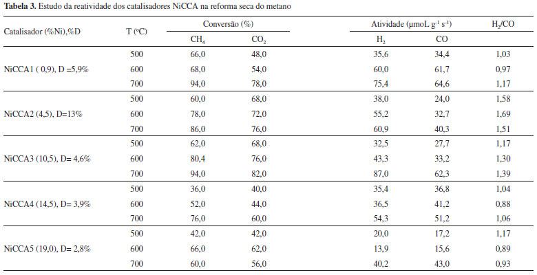 Reação de reforma seca A temperatura reacional variou de 500 a 700 ºC, devido ao fato de que a reação de reforma do metano com dióxido de carbono quando conduzida a elevadas temperaturas (800, 900 ºC) apresenta menor deposição de coque; assim, trabalhar em condições que favoreçam a deposição de coque pode ser mais indicado para se levantar informações quanto à estabilidade catalítica da amostra. Os resultados obtidos na reação de reforma seca realizada às temperaturas de 500, 600 e 700 ºC para os catalisadores de NiCCA, após redução a 500 ºC em atmosfera de hidrogênio são apresentados na Tabela 3.