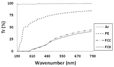 Light transmittance (tr) Light barrier measures ultraviolet and visible light transmission; it is expressed as a percentage of light transmission within a wavelength range.46 Figure 3 illustrates the Tr percentage in the films FCC and FCII within the wavelength of 190 to 780 nm as compared with polyethylene (PE) films; air transmittance was the reference.