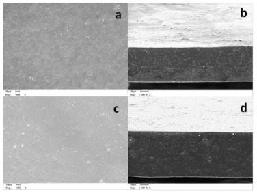 ![]() Figure 6. Scanning electron microscopy of canihua flour films. a. Surface of the film FCC, b. Cross-sections of the film FCC, c. Surface of the film FCII d. Cross-sections of the film FCII