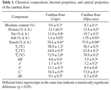 RESULTS AND DISCUSSION Raw material characterization The flours isolated from canihua grains of the varieties cupi and illpa-inia did not differ significantly in terms of the lipid, ash, or starch content; however, they were statistically different with respect to the moisture and protein contents (Table 1). The canihua flour from variety illpa-inia presented higher protein content.