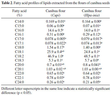 DSC furnished the temperature range in which gelatinization occurred (T0, Tp and Tf). The canihua flour from variety illpa-inia presented lower gelatinization temperatures and enthalpy (T0, Tp, Tf, and ΔH). The gelatinization temperatures were close to values reported by Steffolani et al.39 in the case of canihua starch. The canihua flours obtained here displayed larger lipid but smaller protein and ash contents as compared with the whole flour and grains of canihua of the cupi variety reported by others researchers.40,23 The color parameters and ΔE values of the canihua flour varieties investigated in this work differed significantly-the variety illpa-inia afforded lower b*, L*, ΔE values and was less yellowish. Rosell et al.40 described larger a* and b* but smaller L* values for the whole canihua flour, which displayed a brownish color. Table 2 summarizes the fatty acids profile of the oils extracted from the canihua flours of the varieties cupi and illpa-inia. The extracted oils presented higher percentage of linoleic acid (C18:2), followed by oleic (C18:1), palmitic (C16:0), linolenic (C18:3), and stearic (C18:0) acids; 75 and 25% of the fatty acids were unsaturated and saturated, respectively. Repo-Carrasco et al.22 reported lower values of linoleic and oleic acids and higher values of palmitic acid for the oil extracted from canihua grains. According to the Tukey test (p < 0.05), the oil extracted from the canihua flour of the variety illpa-inia contained slightly larger percentage of linolenic acid (C18:3, 5.69%) as compared with the oil extracted from the canihua flour of the variety cupi.