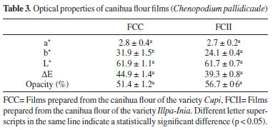 Table 3 lists the color and opacity parameters measured for FCC and FCII. Both FCC and FCII exhibited similar color difference values (ΔE*), which were higher than those reported for the films prepared from banana, achira, or amaranth flour.10,17,26 The proteins present in the biofilm flours could affect the ΔE* of the films.26 The b* values attested that FCC and FCII had intense yellow color, but FCII was lighter than FCC. Indeed, the b* parameter was lower in the former case (b*= 24.10 ± 0.39 and 31.94 ± 1.5 for FCII and FCC, respectively). Other researchers41 described similar b* values for films prepared from soybean protein (b*= 32.54). Proteins and pigments like carotenoids and flavonoids could account for the yellow color of the canihua flour films.10,42 Repo-Carrasco-Valencia et al.21,22 reported that flavonoids and tocopherols exist in canihua oil and grains.