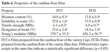 The a* parameter was positive for both FCII and FCC, indicating typical red shades. The opacity of these films was similar: 51.4 ± 1.2% and 56.7 ± 0.6% for FCC and FCII, respectively. These values were much higher than reported for amaranth flour films.18 The large opacity of the films could stem from the high contents of proteins, lipids, fibers, and phenolic compounds present in the flours.10 Mechanical properties of canihua flour films Table 4 depicts the tensile strength, elongation at break, and Young modulus values for FCC and FCII. Tensile strength corresponds to the resilience of the material to support traction stresses and depends largely on the intensity and distribution of the intra- and intermolecular interactions within the polymeric matrix.43 According to Table 4, FCII and FCC had similar tensile strength values. However, FCII had lower elongation and higher Young modulus values than FCC. The high tensile strength and Young modulus as well as the low elongation values detected for the biofilms evaluated in this work may have resulted from protein denaturation during the process of alkaline extraction of the canihua flour. This process may have elicited reticulated intra- and intermolecular bonds involving protein S-S bonds,44,45 to give more rigid films. These films should present weaker interactions between polymers and the lipids or antioxidants present in the polymeric matrix, but stronger intra- and intermolecular interactions between the polymers. On the other hand, the larger Young modulus values registered for FCII could arise from the higher protein content in the original flour (Table 1), as reported by other authors.10