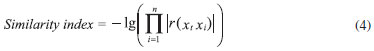 Methanol (HPLC grade, Kermel Co. Ltd., Tianjin, China), acetonitrile (HPLC grade, Hanbang Co. Ltd., Jiangsu, China) and double distilled water were used to prepare mobile phase. Instruments All the chromatograms were collected from Shimadzu LC-10ATvp high performance liquid chromatography equipped with a Shimadzu SPD-10A vp diode array detector (Shimadzu Co. Ltd., Japan). Sample preparation Raw RPT sample was ground into powder at first. 0.4 g of the powder was accurately weighed and extracted using an ultrasonator with 50 mL of 30% methanol for 30 min. After centrifugation for 5 min, the upper solution was filtered with 0.2 µm filter membrane. Then, the solution was diluted in a 50 mL volumetric flask. Three sample solutions were extracted from each batch of RPT product by replicating this procedure three times, generating a total of 27 sample solutions. Additionally, one sample solution was extracted from the standard RPT sample by using this approach. Chromatographic procedure Column: Kromasil5-C18 (4.6 mm × 150 mm, 5 µm, Hanbang Co. Ltd., Jiangsu, China); Injection volume: 20 µL; flow rate: 0.6 mL min-1; Column temperature: 35 ºC; Mobile phase: Water(A) and solvent (B). Solvent (B) comprises methanol and acetonitrile (70/30, v/v) solution with the linear gradient elution program of 20 - 55% solvent (B) for 0 - 50 min. The detection wavelength was 320 nm. Validation of extraction and HPLC method The reproducibility of the extraction method was investigated through six replicate sample solutions which are extracted from one RPT sample. Six replicate analyses of one sample solution were carried out to assess the repeatability of HPLC method. The stability of sample solutions was tested with a sample solution every 2 hours in 12 hours. For recovery test, known amounts of puerarin and daidzein standards were added to sample solutions. Their amounts were quantified by the developed HPLC method and the recovery of puerarin and daidzein were calculated. Software and dataset All data processing was done with subroutines developed in Matlab (Ver. 7.0). The input matrix of PCA was constructed by assembling chromatographic data as row vectors. The input matrix was mean centered in the PCA procedure. Chemometric method Correlation optimized warping19,24 achieves the correction of retention time shift by warping the chromatographic profiles. The correction can be achieved without the chemical information of the samples being analyzed and the resolution of each peak in chromatograms. The algorithm aligns a sample chromatogram towards a target chromatogram (also known as reference chromatogram) by warping the sample chromatogram, namely piecewise linear stretching and compressing of the sample chromatogram. In the procedure of COW, the sample chromatogram x, and the target chromatogram, T, are divided into several segments which is defined by a user-specified parameter called segment length. Then, these segments are warped, meaning their length is stretched or shortened by shifting the position of its end points a limited number of points which is defined by the parameter slack size. When the length of warped segment in the sample chromatogram and that of target chromatogram is different, the former is linearly interpolated to the same number of points as the latter. Obviously, segment length and slack size have significant influence on the result of COW. We need optimize the two parameters when using COW approach. Besides the two parameters, target chromatogram also has influence on the result of COW. Thus, selecting a proper target chromatogram is also important in COW. Usually, the two parameters and target chromatogram is empirically selected. This is a subjective method and is not fit for the quality evaluation of TCM. Skov et al. proposed ACOW approach in their article.24 This approach provides an automated and quantitative algorithm for optimizing the warping parameters and selecting the target chromatogram. It is a standardized, objective and automated approach. The algorithm for optimizing segment length and slack size is based on three indices: simplicity, peak factor and warping effect. Simplicity is used to measure how well a set of chromatograms is aligned. It is defined as: ![]() where X is the matrix of the chromatograms to be aligned, x(i,j) is the element of matrix X, and SVD denotes the singular value decomposition. The value of simplicity ranges from 0 to 1. The larger value of simplicity means the better alignment. Peak factor is defined as Eq.2: ![]() In Eq.2, x(i) and xw(i) is the original and the warped chromatogram respectively. ||x(i)|| is the Euclidian length for x(i). Peak factor is introduced to quantitatively indicate the change of a chromatogram in the warping procedure. The larger value means the smaller change of the peak area and shape in the warped chromatogram. The aim of retention time shift correction is aligning chromatograms while preserving the profiles as much as possible. The simplicity and peak factor should be taken into account at the same time when optimizing segment length and slack size. Hence, warping effect is defined as the combination of simplicity and peak factor: ![]() Obviously, warping effect can quantitatively measure the result of alignment. The largest value of warping effect corresponds to the best alignment. Thus, optimizing segment length and slack size means maximizing warping effect. Skov et al.24 suggested the optimal searching range of segment length should be from The approach for selecting the target chromatogram is based on the similarity index, which is the product of correlation coefficients between all individual chromatograms. For a chromatogram xt, its similarity index is defined as: ![]() where r(xtxi) is the conventional correlation coefficient between xt and xi, and xi is the chromatogram to be aligned. The chromatogram that has the smallest similarity index is regarded as the optimal target chromatogram.