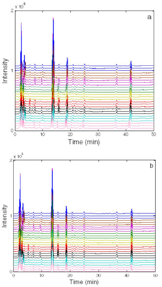 ![]() Figure 2. Chromatographic fingerprints of RPT samples (a) unaligned; (b) aligned. The chromatographic profile from bottom to up is the fingerprint of A1, A2, A3, B1 ...... to I3 respectively