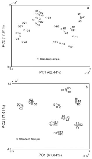 ![]() Figure 3. Score plot of PCA resulted from (a) unaligned fingerprints; (b) aligned fingerprints