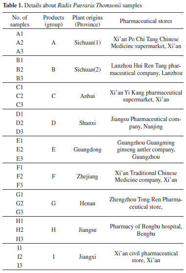 EXPERIMENTAL Plant material and reagents Nine batches of authentic Radix Pueraria thomsonii products were purchased from nine pharmaceutical stores. The summary of these products is shown in Table 1. The standard sample of Radix Pueraria thomsonii was purchased from National Institute for the Control of Pharmaceutical and Biological Products (China).