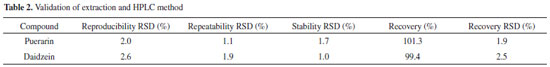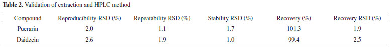RESULTS AND DISCUSSION Fingerprints of the RPT samples The fingerprints of the investigated RPT samples were constructed with their entire chromatograms. The extraction and chromatographic method are described in the "EXPERIMENTAL" section. The developed extraction and chromatographic method were validated. Puerarin and daidzein are two main active isoflavones in RPT.27 Puerarin has been used as the compulsory standard to authenticate the quality of RPT by the government of China.28 The content of daidzein is also regarded as an important index to assess the quality of RPT in many researches.29,30 Thus, we used puerarin and daidzein as standards to validate the extraction and chromatographic method. The validation result is listed in Table 2, Table 1S, Table 2S, Table 3S, Table 4S, Table 5S, Table 6S, Table 7S and Table 8S.