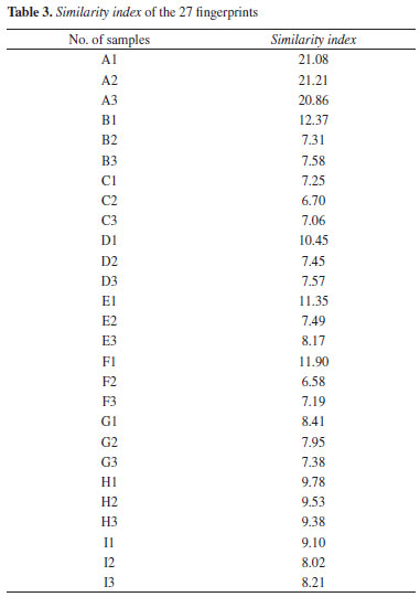 Alignment of the fingerprints Firstly, the target fingerprint was selected from the fingerprints of all the 27 samples according to the approach described in the "chemometric method" section. The similarity index of these fingerprints was calculated and listed in Table 3. As shown in Table 3, sample F2 has the smallest similarity index. Thus, the fingerprint of sample F2 was used as the target fingerprint. Then, the two alignment parameters were optimized by using the automated algorithm presented in the "chemometric method" section. The average peak width is around 55 data points in the obtained 27 fingerprints. Correspondingly, the searching space of segment length and slack size was set to [26, 83] and [1, 15] respectively. The obtained optimal segment length is 27 and the slack size is 2. Figure 2b is the aligned fingerprints of these RPT samples. Obviously, an increase in the retention time precision afforded by the alignment is visible in Figure 2b. It is demonstrated that similarity index is a practicable index for selecting target fingerprint and ACOW is an effective approach for aligning fingerprints of RPT.