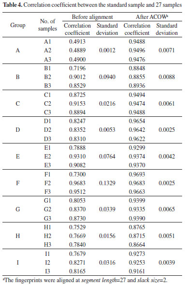In addition, we aligned the fingerprints of these RPT samples at several empirically selected segment length and slack size. The selected segment length and slack size include: [segment length=30, slack size=15] (denoted as Alignment1), [segment length=55, slack size=2] (denoted as Alignment2) and [segment length=55, slack size=15] (denoted as Alignment3). The aligned fingerprints are shown in Figure 1S (in the supplementary material). These fingerprints were analyzed in the subsequent section as a comparison to the fingerprints obtained from ACOW. Evaluating the quality of RPT samples Similarity estimation and PCA are two conventional chemometric methods which are usually used to analyze the fingerprint of TCM. Thus, the two methods were investigated. Similarity estimation Correlation coefficient is one of the most commonly used indices for evaluating the similarity between two fingerprints. Thus, the correlation coefficient between the fingerprint of the standard sample and the fingerprints of the 27 RPT samples was calculated and shown in Table 4. In this case, the quality of the samples from the same group should be about the same as well as distinct from the samples from other groups. Correspondingly, the correlation coefficient of the samples from the same group should be about the same and the correlation coefficient of the samples from different groups should be different. As shown in Table 4, satisfactory result can not be obtained from unaligned fingerprints. In group B, E, F, there is obvious difference in the correlation coefficient of the samples from same group. Actually, not only the difference of chemical composition of the samples, but also the misalignment of the fingerprints, leads to the significant difference in correlation coefficient. The retention time shift severely impedes the quality evaluation of these samples. It is impracticable and unreasonable to calculate the correlation coefficient without aligning the fingerprints of these samples. Thus, correcting the retention shift is necessary to get a reasonable and acceptable evaluation result.