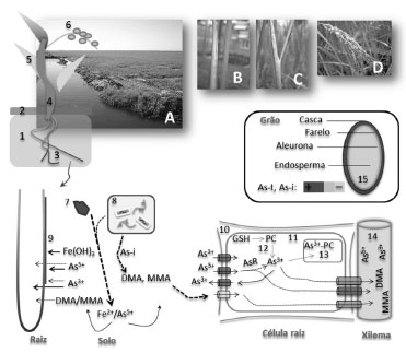 ![]() Figura 1. Etapas do desenvolvimento do arroz no cultivo irrigado e painel esquemático de variáveis envolvidas na relação arroz / As. A: taipa de cultura de arroz em Rio Grande, RS, Brasil; B: floração do arroz ("embarrigamento"); C: aparecimento da folha bandeira; D: panículo com grãos maduros; 1: solo; 2: lâmina de água (irrigado); 3: raízes; 4: colmo; 5: folhas; 6: panículo; 7: óxido/hidróxido de Fe; 8: microrganismos de solo; 9: placa de Fe; 10: parede celular; 11: citoplasma; 12: ligação fitoquelatina (PC)-As3+/ transporte; 13: vacúolo celular; 14: xilema; 15: diferentes partes do grão e influência na concentração de As. Seta tracejada: biotransformação ou menor intensidade de absorção; AsR: As redutase