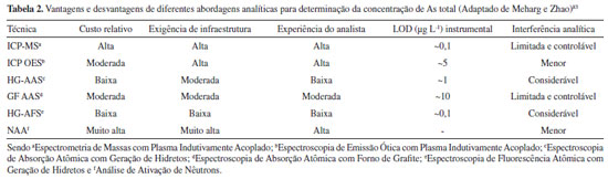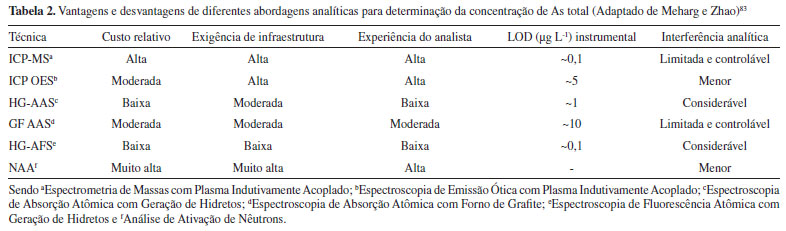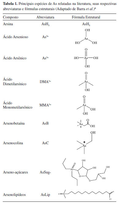 IDepartamento de Análises Clínicas, Toxicológicas e Bromatológicas, Faculdade de Ciências Farmacêuticas de Ribeirão Preto, Universidade de São Paulo, 14040-903 Ribeirão Preto - SP, Brasil Recebido em 03/06/2014 *e-mail: bruno.lemos@ufabc.edu.br Arsenic is considered a semimetal, and its wide distribution in the Earth's crust in different chemical forms, including organic and inorganic species, has a great deal of influence on the mechanisms of toxicity. Exposure to arsenic can be either through occupational practice (use of pesticides) or by the consumption of water and food containing the element. Rice is considered a fundamental constituent of the basic diet of Brazilians and is usually cultivated in flooded conditions. Such a plantation system results in an increased amount of As in the soil and hence a greater accumulation of As in the plant, which is highlighted by the inorganic species' classification as highly toxic. Besides the use of mitigation techniques to reduce the toxicological risk, monitoring the concentration of As and its chemical species in rice and rice products is required through the establishment of legislation in the area. Thus, some world organizations are conducting improved research to determine and establish acceptable concentrations of As and its chemical species in rice, e. g., in 2012, FDA researchers described a chemical speciation methodology for As in rice and rice products. Hence, the application of existing chemical speciation methods and the establishment of parameters for ensuring food security and exposure risk assessment deserve particular consideration. INTRODUÇÃO Aspectos toxicológicos do arsênio e suas fontes de exposição O arsênio (As) é elemento químico de massa atômica 75, considerado tóxico e amplamente distribuído na biosfera,1 podendo ser encontrado na atmosfera, na água, em solos, sedimentos e organismos.2 É considerado um metaloide ou ametal, já que partilha características físico-químicas tanto de metais quanto de ametais.1 O elemento pode se apresentar em formas químicas orgânicas, como o ácido monometilarsônico (MMA), ácido dimetilarsínico (DMA), arsenobetaína (AsB) e arsenocolina (AsC); e inorgânicas - reconhecidamente mais tóxicas - formadas por íons arsenato (As+5) e arsenito (As+3).3 Na Tabela 1 estão descritas as espécies de As mais frequentemente relatadas na literatura, suas respectivas fórmulas e abreviaturas.