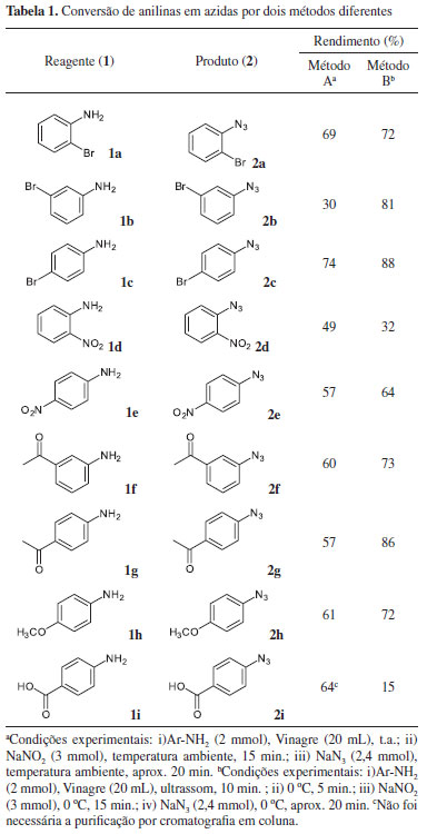 As análises de cromatografia em camada delgada de todas as reações mostraram que as azidas apresentam um valor muito maior de Rf em relação às anilinas. Isso nos motivou a escolher um solvente mais apolar para a extração que não solubilizasse o ácido acético do vinagre. A formação do subproduto também nos obrigou a realizar a reação em baixa temperatura. Assim, foi desenvolvido o método usando hexano como solvente e realizando a banho de gelo. As oito anilinas utilizadas no método anterior também forneceram as respectivas azidas em rendimentos maiores e sem a presença do subproduto de acoplamento diazo (Tabela 1). Este método apresenta vantagens em relação aos métodos já descritos por utilizar um solvente/reagente facilmente disponível, de baixíssimo custo e oriundo de fonte renovável (vinagre). Além disso, o uso de um ácido mais fraco dificulta a protonação da anilina, permitindo que o par de elétrons desemparelhados esteja mais disponível para o ataque ao eletrófilo (cátion nitrosônio NO+, provavelmente formado), favorecendo mais a formação do sal de arenodiazônio.16 E, por fim, observamos que nesta nova condição reacional não há necessidade de purificação, uma vez que após evaporação do produto obtivemos exclusivamente a azida aromática. As únicas exceções ficaram por conta da orto-nitroanilina, para a qual obtivemos baixos rendimentos nas duas condições testadas, e do ácido 4-aminobenzóico. Neste caso, devido à presença do grupo ácido carboxílico, a extração utilizando acetato de etila se mostrou mais eficiente do que usando hexano.