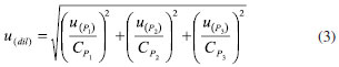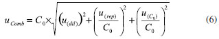 Assim, a Equação 3 está associada a equações do tipo: dil = CP1 X CP2 X CP3 ou dil = CP1/CP2/CP3. Essas duas equações, nenhuma delas presentes no artigo, não representam nenhuma grandeza física mensurável, uma vez que diluição (dil) não é uma grandeza, mas um procedimento experimental. Elas apenas calculam produtos ou divisões de valores. Logo, a Equação 3 não tem nenhum significado metrológico. Além do mais, ela também apresenta uma incoerência de notação, pois usa o símbolo u, seguido de um índice, para significar ao mesmo tempo incerteza relativa (udil) e incerteza padrão (uP1, uP2 e uP3), dificultando a compreensão do trabalho. O mensurando é especificado no artigo como sendo a concentração C0 da ε-caprolactama, que migrou da embalagem plástica contendo poliamida 6 para um solvente simulante (etanol 95%), por meio de sua Equação 1. A incerteza padrão combinada do mensurando (uC0) é corretamente calculada pela Equação 4, a clássica equação para o desvio padrão de previsão sobre uma reta ajustada pelo método dos mínimos quadrados ordinário, a qual os autores chamam de "incerteza associada à curva analítica". Estranhamente, uma outra incerteza combinada para C0 é calculada, combinando a incerteza padrão relativa do próprio mensurando com a incerteza relativa combinada de diluição dos padrões (u(dil)) e com uma incerteza de repetibilidade (u(rep)) por meio de sua Equação 6: