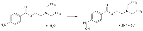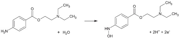 O voltamograma cíclico registrado na presença de procaína, (linha cheia), mostra um pico de oxidação por volta de +1,13 V vs Ag/AgCl(KCl sat.) que pode ser atribuído à oxidação do grupo amino para hidroxilamina em um processo envolvendo dois elétrons e dois prótons, como demonstrado previamente na literatura,18,19 Esquema 1. Ao se alterar a composição do eletrólito suporte para valores de pH até 13 (resultados não mostrados), nota-se uma antecipação do valor de potencial de pico para +0,85 V vs Ag/AgCl(KCl sat.), o que corrobora com o mecanismo reportado no Esquema 1. Essa antecipação do potencial de pico devido à alteração do pH do eletrólito suporte já foi utilizada na literatura por Stradiotto e colaboradores2 para detecção de procaína em formulações farmacêuticas utilizando eletrodos impressos de carbono.