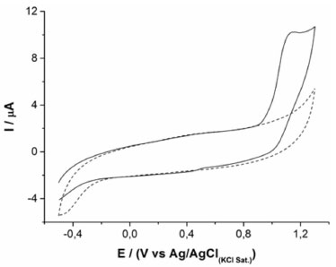 ![]() Figura 1. Voltamogramas cíclicos registrados com eletrodo de carbono vítreo em soluçao contendo NaCl 0,5 mol L-1 + HCl 0,05 mol L-1 na ausência (- - -) e presença de procaína 1 mmol L-1 (-). Velocidade de varredura = 50 mV s-1