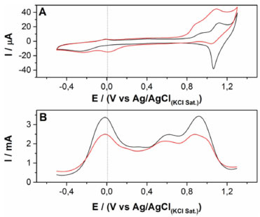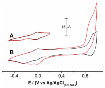 ![]() Figura 2. Voltamogramas cíclicos (A) e de onda quadrada (B) registrados com eletrodo de carbono vítreo modificado com filme de RuOHCF (valor final da concentraçao de RuCl3 e K3Fe(CN)6 = 1 mmol L-1) e 50 ciclos em soluçao contendo NaNO3 0,5 mol L-1 e HCl 0,05 mol L-1, na ausência (preta) e na presença (vermelha) de procaína 1 mmol L-1. Voltamogramas cíclicos foram registrados com velocidade de varredura de 50 mV s-1 e os voltamogramas de onda quadrada foram registrados utilizando os seguintes parâmetros: frequência = 60 Hz, Estep = 0,005 V e Eamplitude = 0,1 V