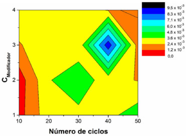 ![]() Figura 4. Dependência entre concentraçao de modificador (valor final da concentraçao de RuCl3 e K3Fe(CN)6), número de ciclos e coeficiente angular da curva analítica para procaína (mapa de cores em mA µmol L-1). Voltamogramas de onda quadrada foram registrados com os seguintes parâmetros: frequência = 60 Hz, Estep = 0,005 V e Eamplitude = 0,1 V