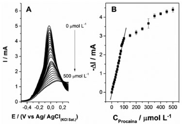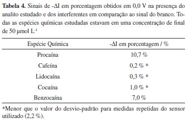 A Tabela 4 mostra o decaimento do sinal eletroquímico obtido em 0,0 V em porcentagem comparado com o branco analítico para potenciais espécies químicas encontradas como adulterantes em amostras de cocaína apreendidas,5,33 visando demonstrar a seletividade da detecção de procaína nessas amostras. As espécies químicas testadas foram: cocaína, lidocaína, benzocaína e cafeína. Vale destacar que nas formulações farmacêuticas não foi encontrada nenhuma combinação dessas espécies ativas com características similares a procaína. Além disso, outros interferentes usualmente encontrados em formulações farmacêuticas como sulfato de cobre, glicose e cloreto de potássio não apresentaram nenhum decaimento do sinal eletroquímico obtido em 0,0 V. Pode-se observar da Tabela 4 que a única espécie encontrada como interferente é a benzocaína. Para tentar contornar essa limitação o grupo já iniciou trabalho para desenvolver um eletrodo molecularmente impresso34, uma vez que esses materiais podem evitar a chegada da benzocaína até a superfície do eletrodo modificado evitando a interferência oriunda dessa substância.