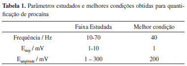 Nota-se, a partir da Figura 4, que a variação do coeficiente angular da curva analítica aumenta com o aumento do número de ciclos e da concentração dos agentes modificantes em solução para a deposição eletroquímica até que os parâmetros avaliados atinjam o valor de 40 ciclos de deposição e concentração final de RuCl3 e K3Fe(CN)6 igual à 3 mmol L-1 para cada espécie na solução de modificação, sendo essa a melhor condição utilizada nas próximas etapas do trabalho. Avaliação dos melhores parâmetros da técnica de voltametria de onda quadrada para quantificação da procaína e da temperatura de formação do filme de hexacianoferrato de rutênio Nessa etapa avaliou-se a influência na detectabilidade da procaína dos parâmetros utilizados na técnica de voltametria de onda quadrada (frequência da aplicação dos pulsos de potencial, passo do potencial (Estep) e amplitude do pulso (Eamplitude)). As melhores condições, assim como a faixa de na qual os parâmetros foram avaliados, estão sumarizados na Tabela 1. Vale destacar que todos os experimentos foram realizados de forma univariada e avaliou-se a média de três replicatas para cada parâmetro estudado na presença de 1 mmol L-1 de procaína.