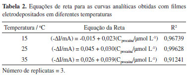 Por fim, foi realizada a avaliação da temperatura durante o processo de eletrodeposição do filme de RuOHCF. Uma vez que esse filme depende de um processo de precipitação do material que irá ser depositado na superfície do eletrodo após um processo eletroquímico, a temperatura deve influenciar e muito na quantidade de material depositado. Sendo assim, curvas analíticas foram construídas para avaliar a influência de filmes depositados em diferentes temperaturas (15, 25 e 35 ºC). A Tabela 2 sumariza as equações de reta das curvas de calibração obtidas na faixa entre 30 e 90 µmol L-1 de procaína para os filmes obtidos em diferentes temperaturas.