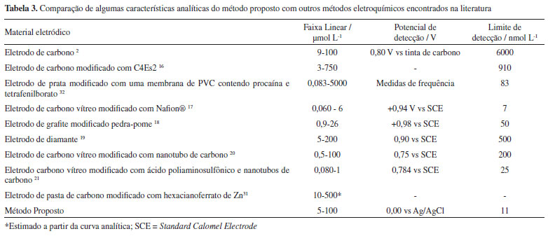 A equação de reta da curva analítica mostrada na Figura 5B (faixa linear entre: 5 e 100 µmol L-1) é: -ΔI / mA = 0,046 + 0,030 (Cprocaína/µmol L-1), com um coeficiente de determinação de 0,996. Os limites de detecção ((3 x desvio padrão do branco) / coeficiente angular da curva de calibração) e quantificação ((10 x desvio padrão do branco) / coeficiente angular da curva de calibração) resultaram em valores de 11 e 36 nmol L-1, respectivamente, concentrações essas significativamente menores que o valor de concentração encontrado na maioria das formulações farmacêuticas (55 mmol L-1) e amostras de drogas de abuso aprendidas pela Polícia Federal. Com o intuito de verificar a aplicação do sensor proposto com outros métodos eletroquímicos da literatura comparou-se algumas características analíticas desses métodos com os obtidos pelo método proposto, Tabela 3. Pode-se observar que a utilização do eletrodo de carbono vítreo modificado com RuOHCF possibilitou a obtenção de um baixo limite de detecção comparado com outros sensores eletroquímicos reportados na literatura, além de permitir a detecção dessa espécie em um baixo valor de potencial aplicado. A estabilidade dos eletrodos modificados foi avaliada por dois ensaios diferentes: 10 medidas consecutivas utilizando o mesmo eletrodo modificado (repetibilidade) e 3 diferentes eletrodos modificados pelo mesmo processo (reprodutibilidade). Os valores de desvio padrão relativo para os sinais medidos em 0,0 V na presença de procaína foram iguais a 2,2 % e 3,0 %, respectivamente, para o primeiro e segundo ensaios, demonstrando assim a estabilidade e reprodutibilidade da deposição do filme de RuOHCF para detecção de procaína.
