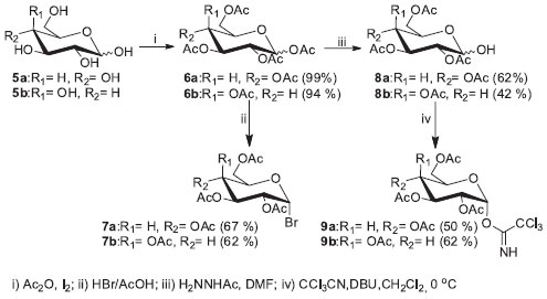 Em ambas as reações estudadas foram utilizados derivados haletos e imidatos de glicose e galactose como unidades doadoras de glicosídeos (Esquema 1). A obtenção destes doadores envolve a preparação de intermediários comuns, os compostos 1,2,3,4,6-penta-O-acetil-D-glicopiranose (6a) e 1,2,3,4,6-penta-O-acetil-D-galactopiranose (6b), os quais foram obtidos a partir da proteção da D-glicose 5a e D-galactose 5b com anidrido acético, na presença de iodo molecular.20 Os derivados haletos, brometo de 2,3,4,6-tetra-O-acetil-α-D-glicopiranosila (7a) e brometo de 2,3,4,6-tetra-O-acetil-α-D-galactopiranosila (7b) foram preparados a partir das unidades monossacarídicas protegidas 6a e 6b com rendimentos de 67% e 62%, respectivamente, pela reação com ácido bromídrico em ácido acético (33%). Os derivados imidatos, 2,3,4,6-tetra-O-acetil-α-D-glicopiranosila tricloroacetimidato (9a) e tricloroacetimidato 2,3,4,6-tetra-O-acetil-α-D-galactopiranosila (9b) foram obtidos com rendimentos de 50% e 62%, respectivamente, pela reação inicial dos compostos 6a e 6b com acetato de hidrazina, para desproteção seletiva em C-1 (carbono anomérico) gerando os compostos 8a e 8b e posterior reação destes com tricloroacetonitrila, na presença de DBU.