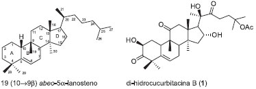 ![]() Figura 1. Estrutura geral do esqueleto cucurbitano e da di-hidrocucurbitacina B