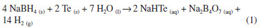 PARTE EXPERIMENTAL Reagentes Os seguintes reagentes foram utilizados na síntese dos PQs de CdTe. Cloreto de cádmio monohidratado (CdCl2.H2O 99%) e ácido clorídrico (HCl, 37%) foram adquiridos da Vetec. Telúrio em pó (200 mesh, 99,8%), ácido 3-mercaptopropiônico (MPA, 99%), ácido propiônico (PPO, 99,5%), 1-propanotiol (PPT, 99%), 2-mercaptoetilamina (MEA, 98%), 1-propilamina (PPA, 98%), 1-dodecanotiol (DDT, 98%), borohidreto de sódio (NaBH4, 98%) todos obtidos da Sigma Aldrich. Hidróxido de sódio (NaOH, 98%) (Neon). Todos os reagentes foram manipulados com equipamentos de proteção individual. Água tipo II (condutividade elétrica menor que 1µS/cm) foi utilizada em todas as sínteses dos NCs e todos os reagentes foram utilizados sem nenhuma purificação adicional. Instrumentos utilizados Agitadores magnéticos (Corning), controladores de temperatura com sensibilidade para 0,1 ºC (Digisence); mantas aquecedoras (Glas-Col), pHmetro (Quimis); espectrofluorímetro (RF-5301PC, Shimadzu), utilizou-se resolução espectral de 1 nm; Espectrofotômetro UV-Vis (UV-2450/2550, Shimadzu), utilizou-se resolução espectral de 0,5 nm; cubetas de quartzo com 1 mm de caminho ótico (Hellma), espectrômetro infravermelho (Spectrum GX, Perkin-Elmer), analisador de tamanho de partículas e de potencial zeta (Delsanano, Beckman Coulter). Síntese dos Pontos Quânticos de CdTe A síntese dos PQs de CdTe foi realizada em duas etapas, a primeira consistiu na preparação de uma solução precursora de telúrio (NaHTe) e a segunda na injeção desta na solução precursora contendo íons cádmio e o ligante de superfície (MPA ou MEA).28 No preparo da solução de NaHTe foram utilizados 0,4 mmol de telúrio (Te) em pó e 0,8 mmol de borohidreto de sódio (NaBH4), os quais foram dissolvidos em 10 mL de água mili-Q, sob atmosfera inerte de argônio. Essa solução foi então submetida a um aquecimento controlado a 80 ºC e agitação constante, por 30 minutos. A reação de formação do precursor de telúrio pode ser descrita de acordo com a equação abaixo:33 ![]() A segunda etapa da síntese foi realizada do seguinte modo, 0,8 mmol de CdCl2.H2O, 2,8 mmol do ligante de superfície a ser utilizado (proporção de Cd2+/Ligante de 1 : 3,5), dissolvidos em 160 mL de água tipo II em agitação constante. O pH dessa solução foi ajustado a 10,0 por adição de NaOH 1,0 mol L-1 (somente para a síntese com o ligante MEA o pH foi ajustado a 5,8 por adição de HCl 1,0 mol L-1) e posteriormente ela foi aquecida a 100 ºC por um sistema controlado em refluxo e sob atmosfera inerte de argônio. Em seguida, adicionou-se 8,0 mL da solução de NaHTe, preparada na primeira etapa, a qual foi transferida com o auxílio de uma seringa de vidro para o balão contendo os íons Cd2+ junto ao ligante. A partir deste momento iniciou-se a formação dos PQs. Alíquotas foram retiradas do meio reacional em intervalos de tempo regulares e os seus respectivos espectros de absorção e de emissão foram registrados, à temperatura ambiente, para o monitoramento da síntese. Para as análises de infravermelho, amostras foram precipitadas pela adição de acetona, cuja função é desestabilizar a dispersão do meio aquoso que contém os PQs, por meio da redução gradual de suas camadas de solvatação, permitindo, assim, a sua agregação seguida de precipitação. Em seguida, foram centrifugadas e lavadas repetidas vezes com acetona e então secas à vácuo. Troca de ligantes Para a troca de ligantes foram utilizadas duas abordagens, uma já conhecida, que se trata da troca de um ligante de cadeia curta por um de cadeia longa,23 e outra ainda não abordada, que é a troca de um ligante de cadeia curta com dois grupos funcionais para outro de cadeia curta, porém com um grupo funcional somente. A primeira abordagem constituiu-se na adição das soluções na seguinte ordem: primeiramente utilizou-se 1 mL da síntese de PQs de CdTe/MPA, 1 mL do novo ligante de superfície (DDT) e 3,5 mL de acetona, a qual é utilizada para diminuir a tensão superficial na interface água/DDT e pelo fato de ser solúvel em ambos os meios. Em seguida, a mistura foi agitada em agitador magnético e aquecida a 68 ºC, acima da temperatura de ebulição da acetona, durante aproximadamente cinco minutos.22,34 Deste modo, os NCs dissolvidos em meio aquoso foram rapidamente transferidos para o meio orgânico (DDT). Essa mudança foi perceptível visualmente pela mudança da coloração da solução e pela fotoluminescência da fase orgânica, quando irradiada com luz UV (365 nm). Posteriormente, a solução foi deixada em repouso por aproximadamente dez minutos. Após a separação de fases, a fase orgânica foi retirada e solubilizada em hexano. A segunda abordagem foi realizada, de acordo com adaptações da literatura,35 da seguinte forma: mediu-se 1,00 g da solução aquosa de PQ de CdTe/MPA diretamente da síntese, 2,50 g de acetona, 2,50 g de hexano e 22,3 mmol do novo ligante (PPT, PPO ou PPA) adicionados nesta ordem em um tubo de ensaio. O hexano é utilizado como solvente para o novo ligante e a acetona para diminuir a tensão superficial entre a fase aquosa e orgânica. Então, o tubo foi agitado vigorosamente à mão por aproximadamente 30 segundos. Desta forma, deixou-se a mistura estabilizar, observou-se que os PQs concentraram-se na interface dos dois solventes. Em seguida, os PQs foram separados da fase aquosa de modo que fossem dispersos em diferentes solventes orgânicos, a fim de se avaliar o solvente mais adequado.