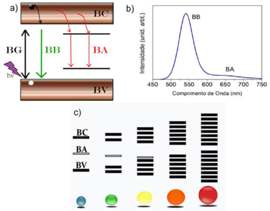 ![]() Figura 2. a) Esquema ilustrativo da formaçao da banda de armadilha; b) espectro de fotoluminescência apresentando a banda de borda (BB) e banda de armadilha (BA); c) esquema do desaparecimento da banda de armadilha