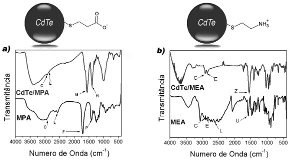 ![]() Figura 3. Espectros IVTF: a) CdTe/MPA e o ligante MPA puro; b) CdTe/MEA e o ligante MEA puro. Os esquemas representam a interaçao entre o PQ de CdTe e o LS